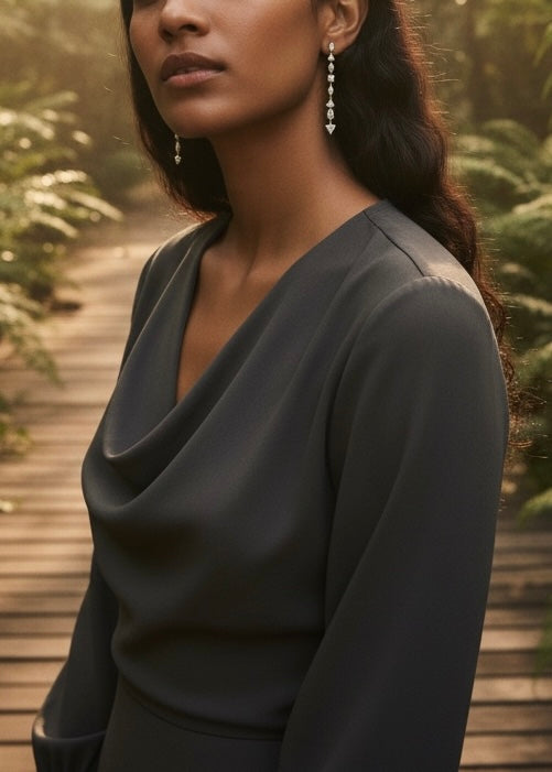 These earrings harmonize contrast with refined precision — bold, fluid, and unmistakably modern.
